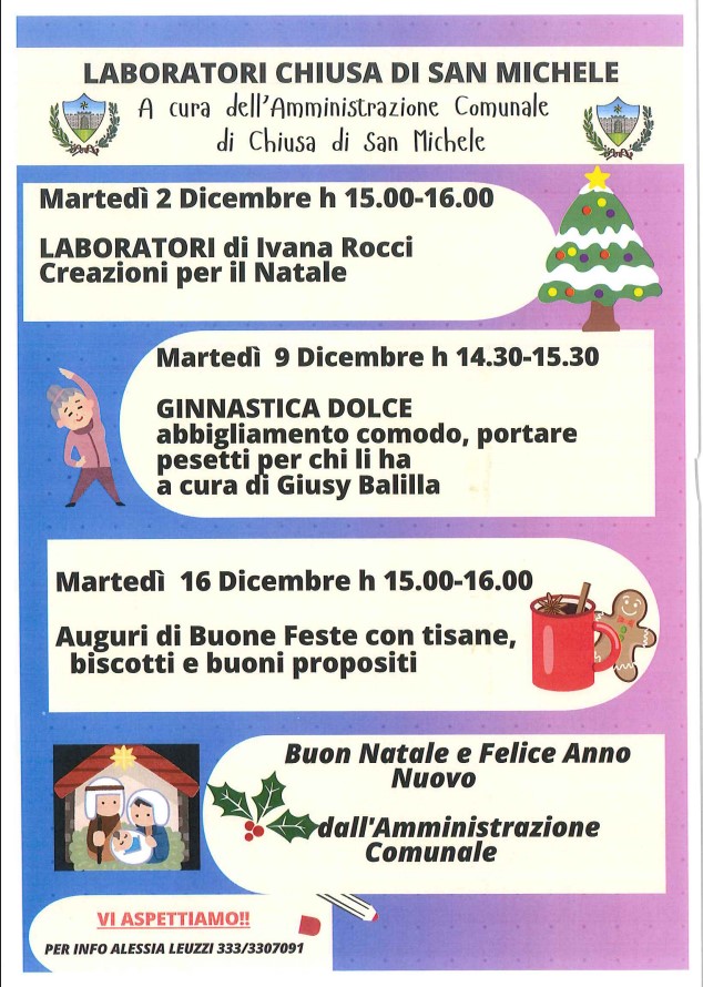 L'Amministrazione Comunale avvisa che per tutti i Martedì del mese di Novembre (il giorno 2-9-16) presso il Salone Polivalente in via General Cantore 14, si svolgeranno una serie di attività a cui è possibile partecipare.