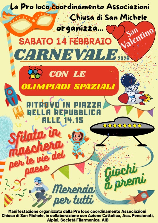 In occasione di Carnevale 2026 La Pro loco coordinamento Associazioni Chiusa di San Michele in collaborazione con Azione Cattolica, Ass. Pensionati, Alpini, Società Filarmonica, AIB organizza una Sfilata in maschera per le vie del Paese con giochi a premi e merenda per tutti.