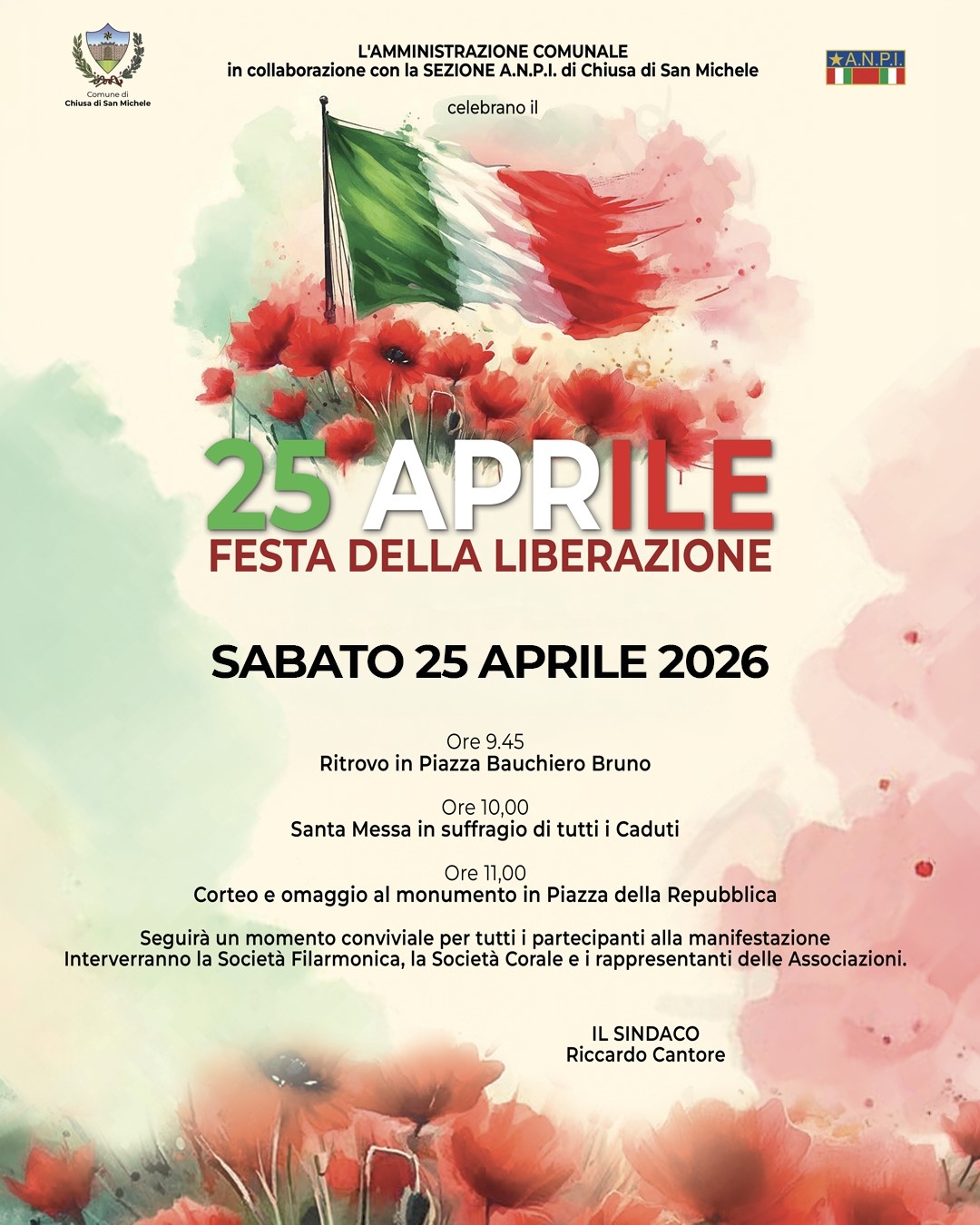 In occasione dell’Anniversario della Liberazione, l’Amministrazione Comunale è lieta di invitarvi Sabato 25 Aprile 2026 alla Cerimonia Ufficiale. il ritrovo sarà in Piazza Bauchiero Bruno alle ore 9:45 (il dettaglio nella locandina allegata)