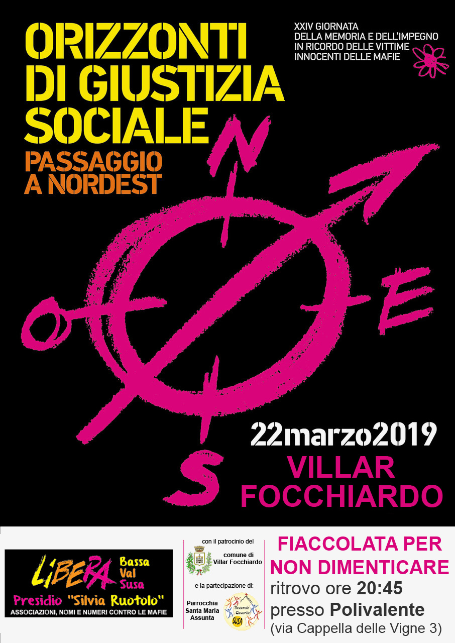 venerdi' 22 marzo 2019 - ritrovo presso il centro polivalente di villar focchiardo alle ore 20.45 : fiaccolata per non dimenticare - xxiv giornata dell'impegno in ricordo delle vittime innocenti delle mafie (si prega di aprire l'allegato).