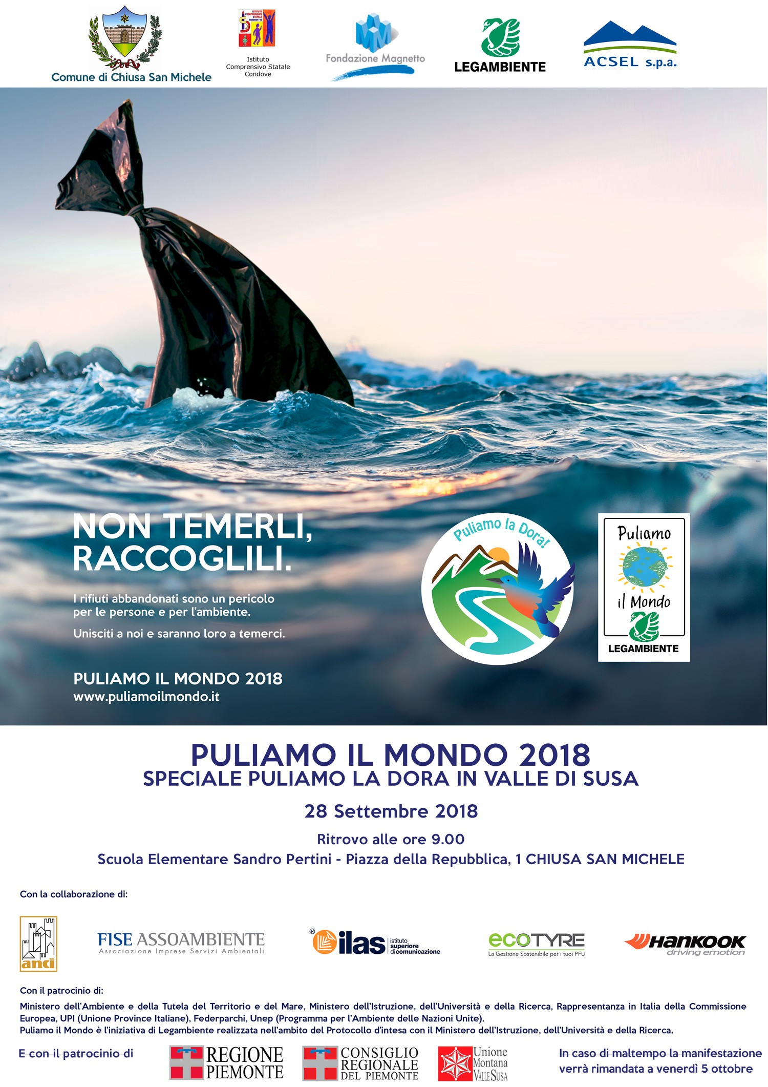 venerdi' 28 settembre 2018 - puliamo la dora in valle di susa - ritrovo ore 9.00 presso scuola elementare sandro pertini - piazza della repubblica chiusa di san michele (per locandina aprire l'allegato).