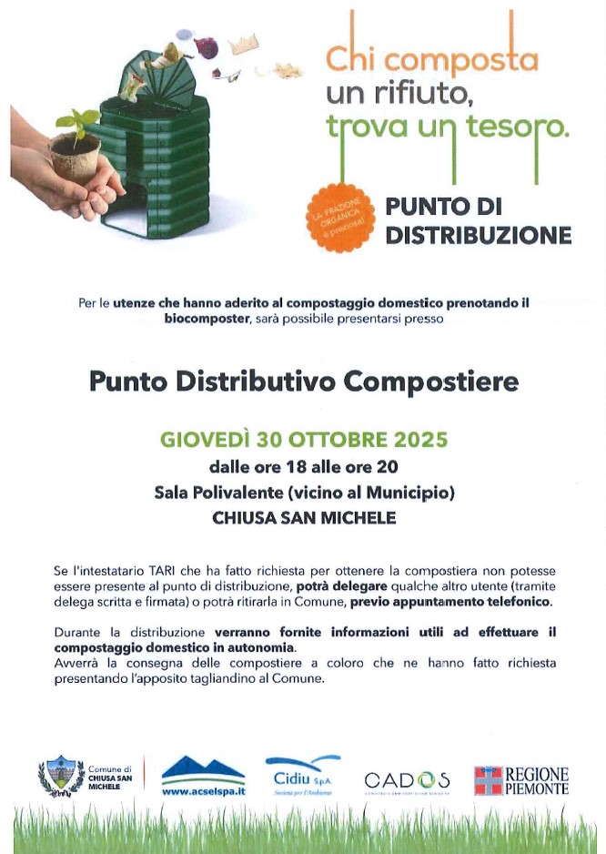 Per le Utenze che hanno aderito al compostaggio domestico prenotando il biocomposter, sarà possibile presentarsi al punto distributivo situato presso il salone Polivalente in via general Cantore 14, Chiusa di san Michele