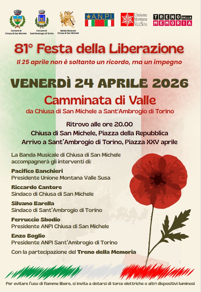 Si comunica che nella giornata di Venerdì 24 Aprile 2026 in occasione della Festa della Liberazione si svolgerà la camminata in Valle da Chiusa di San Michele a Sant'Ambrogio