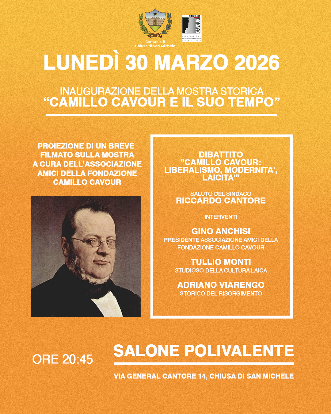 Si comunica ai cittadini che Lunedì 30 Marzo 2026 avverrà l'inaugurazione della mostra storica "Camillo Cavour e il suo tempo".